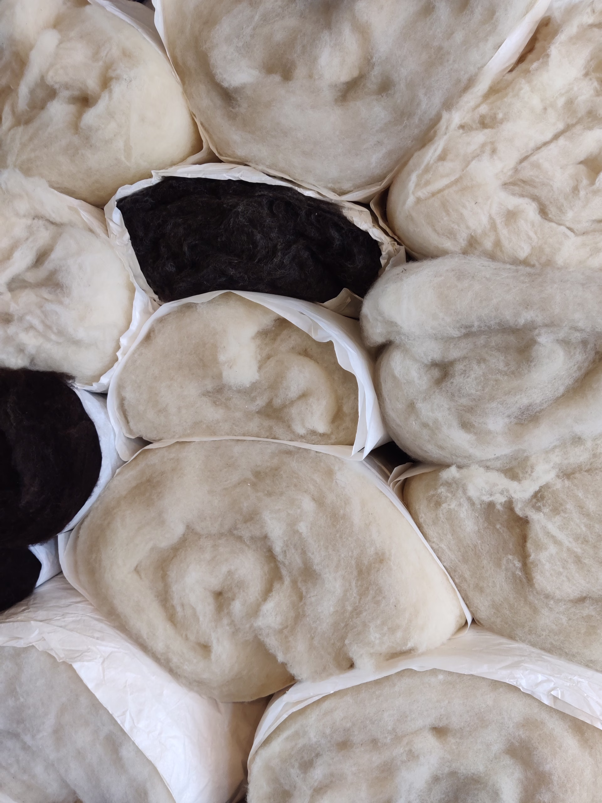 Les lots se présentent en nappes cardées pour le filage et l’aiguilletage. Attention, pour le feutrage à l’eau, n’ayant pas les races des croisements des moutons composants tous les lots, il est parfois compliqué d’assurer un feutrage à l’eau aisé. Les lots avec du Zwartbless et du Vendéen feutrent difficilement à l’eau.